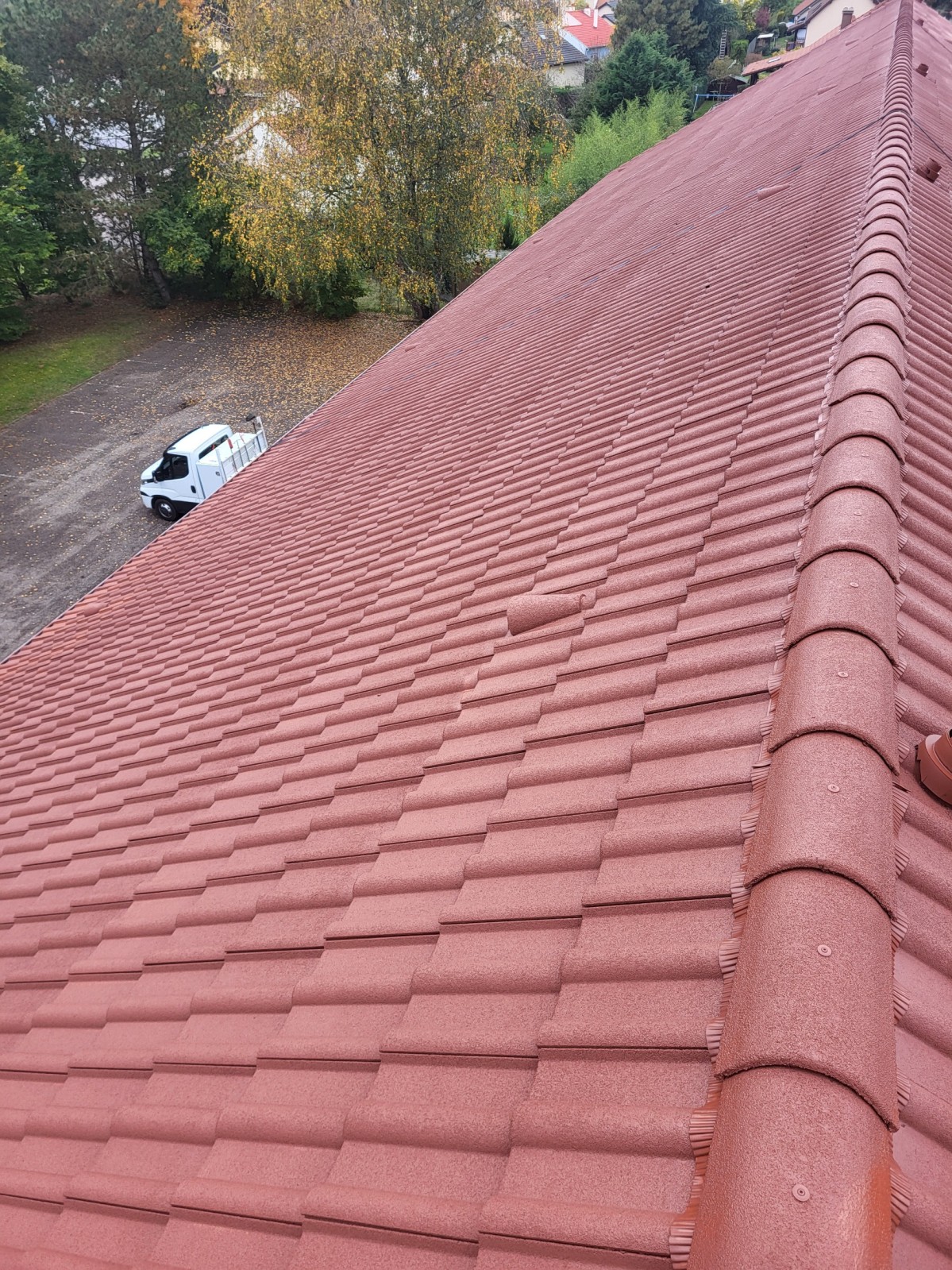 Pour éliminer efficacement les mousses et les lichens sur une toiture, un nettoyage en profondeur est nécessaire pour prévenir les dégradations à long terme. D’abord, sécurisez-vous avec un harnais et utilisez une brosse ou un nettoyeur haute pression à faible intensité pour éviter d’endommager les tuiles. Ensuite, appliquez un produit anti-mousse adapté, idéalement par temps sec pour une meilleure adhérence et un traitement plus efficace. Laissez agir selon les indications du fabricant, généralement quelques jours, pour que les mousses se détachent naturellement sous l’effet de la pluie. En cas d’incrustations importantes, un deuxième traitement pourrait être nécessaire. Enfin, pensez à installer des bandes de cuivre le long du faîtage de la toiture : avec la pluie, l’oxyde de cuivre formé empêchera la réapparition des mousses et lichens. Ce procédé aide à protéger votre toit tout en assurant sa longévité et son esthétique.Cette toiture de l'hôtel Campanil entretenu par nos à St Avold en Moselle, ci vous avez besoin de nos services,n'hésitez pas à nous contacter par mail ou par téléphone, sachez que nos déplacements sont gratuit.